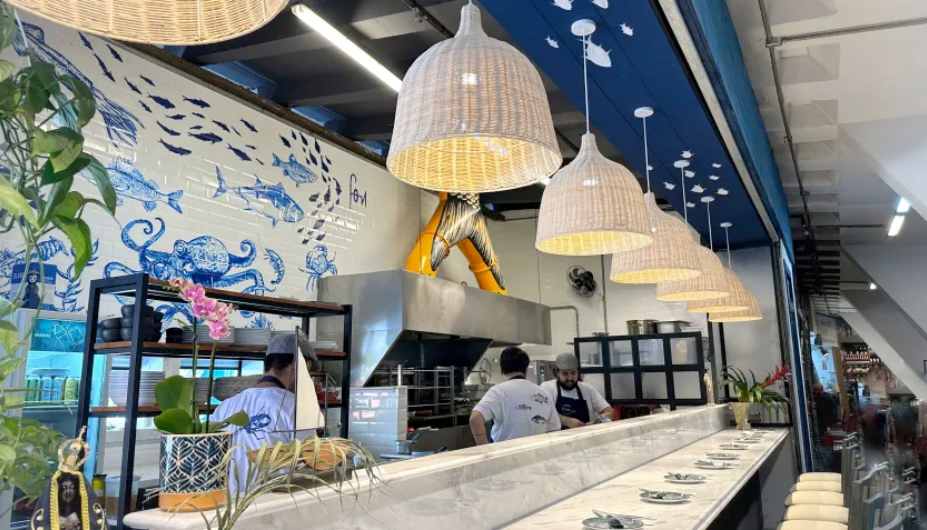 Localizado no Mercadão de Pinheiros, permite escolher peixe direto da peixaria para preparo na parrilla. Ceviche, choripolvo, polvo grelhado e menu executivo são destaques diários.